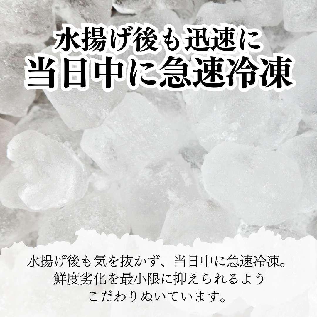 水揚げ後も気を抜かず、当日中に急速冷凍。鮮度劣化を最小限に抑えられるようこだわりぬいています。
