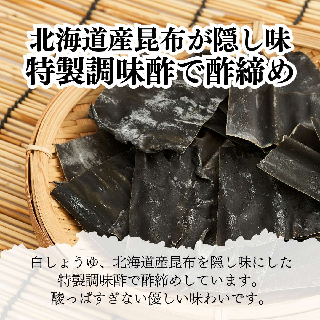 北海道の老舗加工場、釧路丸水工場にて白しょうゆ、北海道産昆布を隠し味にした特製調味酢で酢締めして仕上げました。