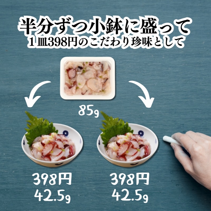 生食感を味わって頂くため、たこを大きめにカットしており、贅沢な味わいを楽しむことができ、見た目のインパクトも大きいです。