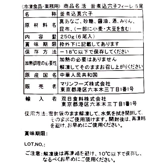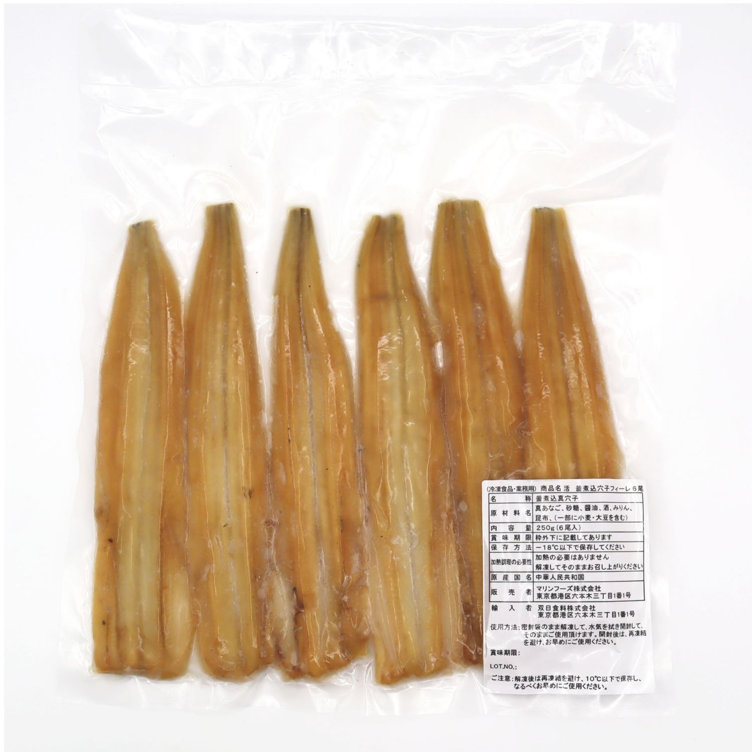 中国産真穴子を醤油、砂糖、酒、みりん、昆布の無添加のタレで煮込み、フィレにしました。