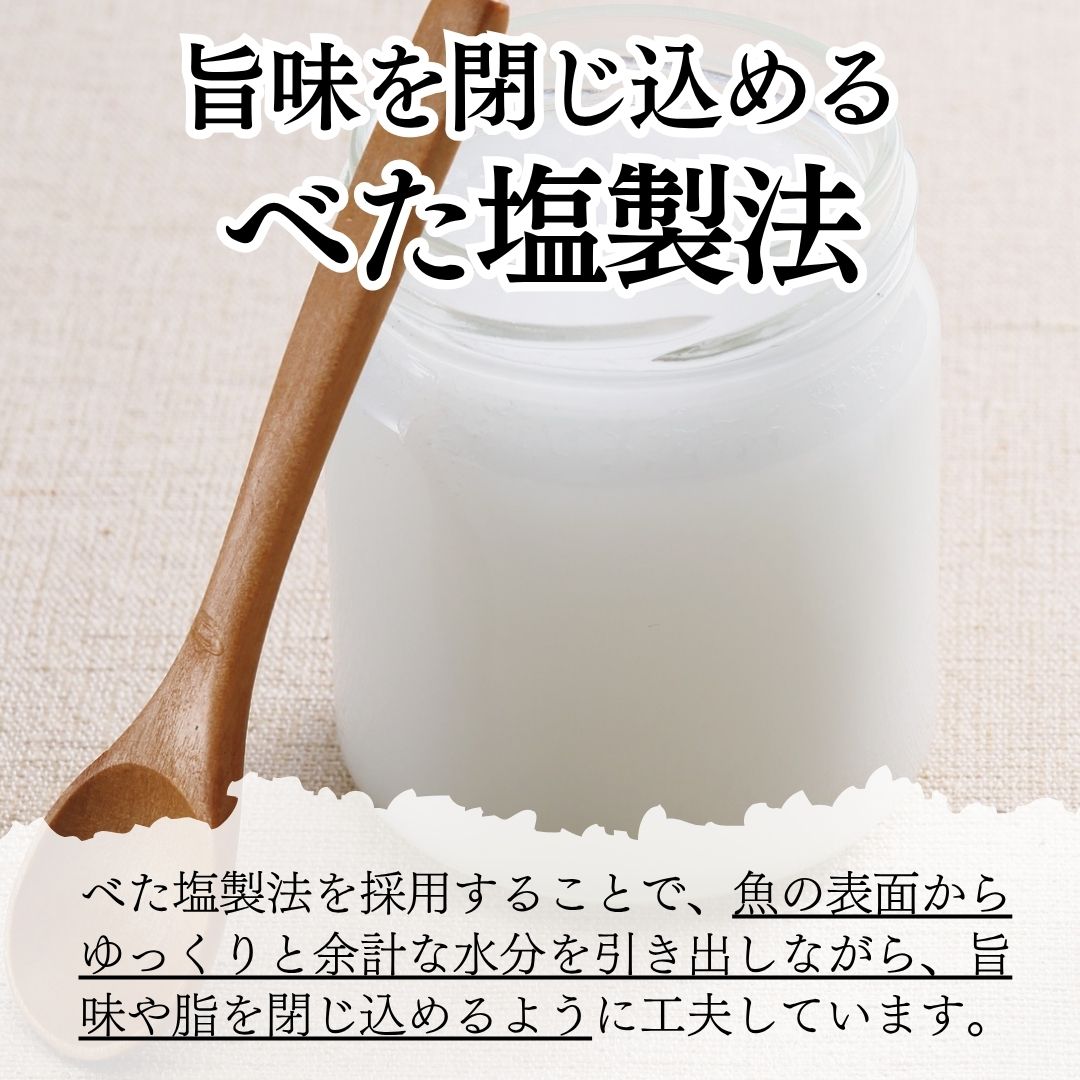 べた塩製法によってじっくりと水分を出しながら、旨味・脂を閉じ込めています。