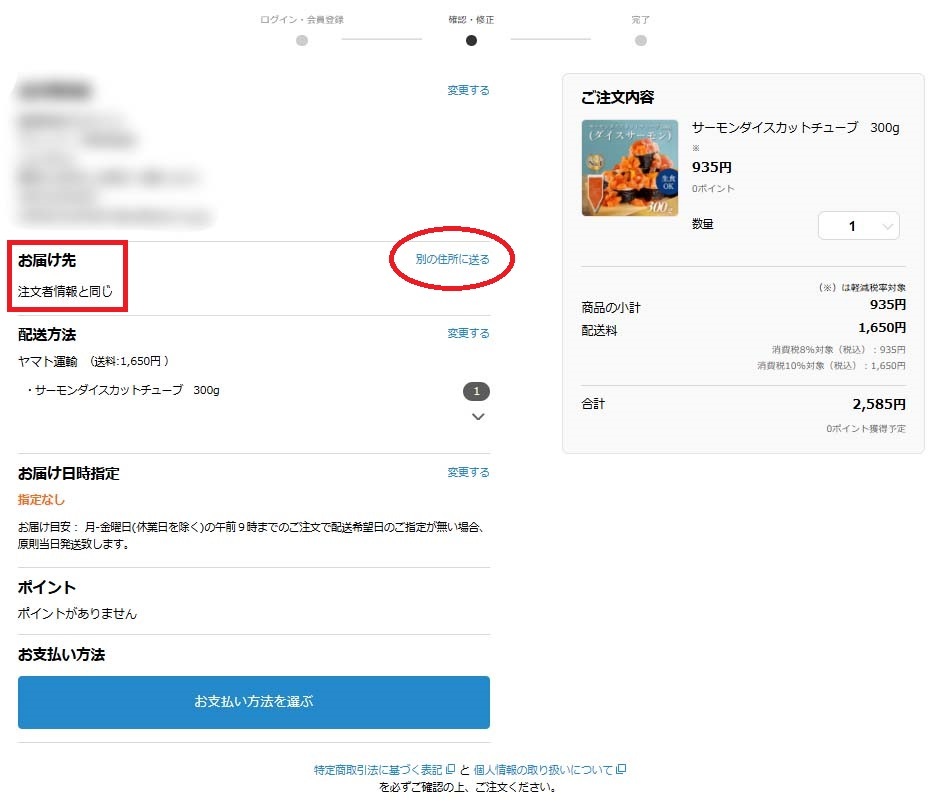 お届け先が会員登録された住所と違う場合は、添付画像にあります「別の住所に送る」をクリックして変更ください。