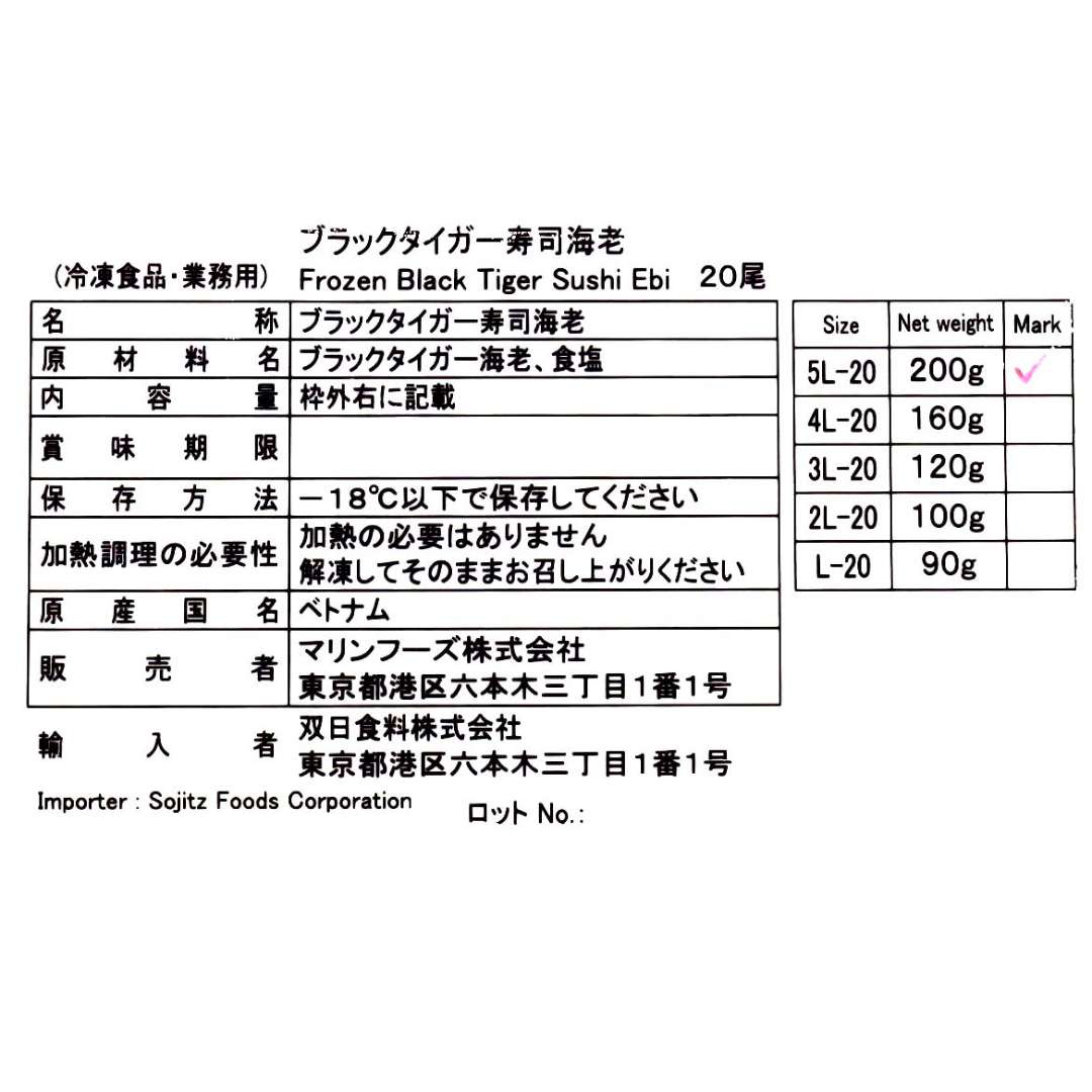【在庫限りで終売】ブラックタイガー海老握り用 5L 20尾入