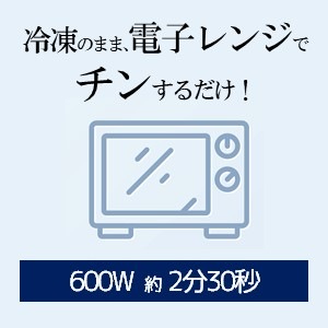| 調理方法 | 【電子レンジの場合】 開封せずに、凍ったまま蒸気口の面を上にして浅いお皿にのせて、加熱してください。加熱中は袋が膨らみますが、蒸気口から抜けてしぼみます。加熱後、袋がしぼんだことを確認してからお皿ごと袋を取り出し、蒸気口を上にして、切り口部を開封してください。 ※700W以上の電子レンジではワット数を下げて加熱してください。